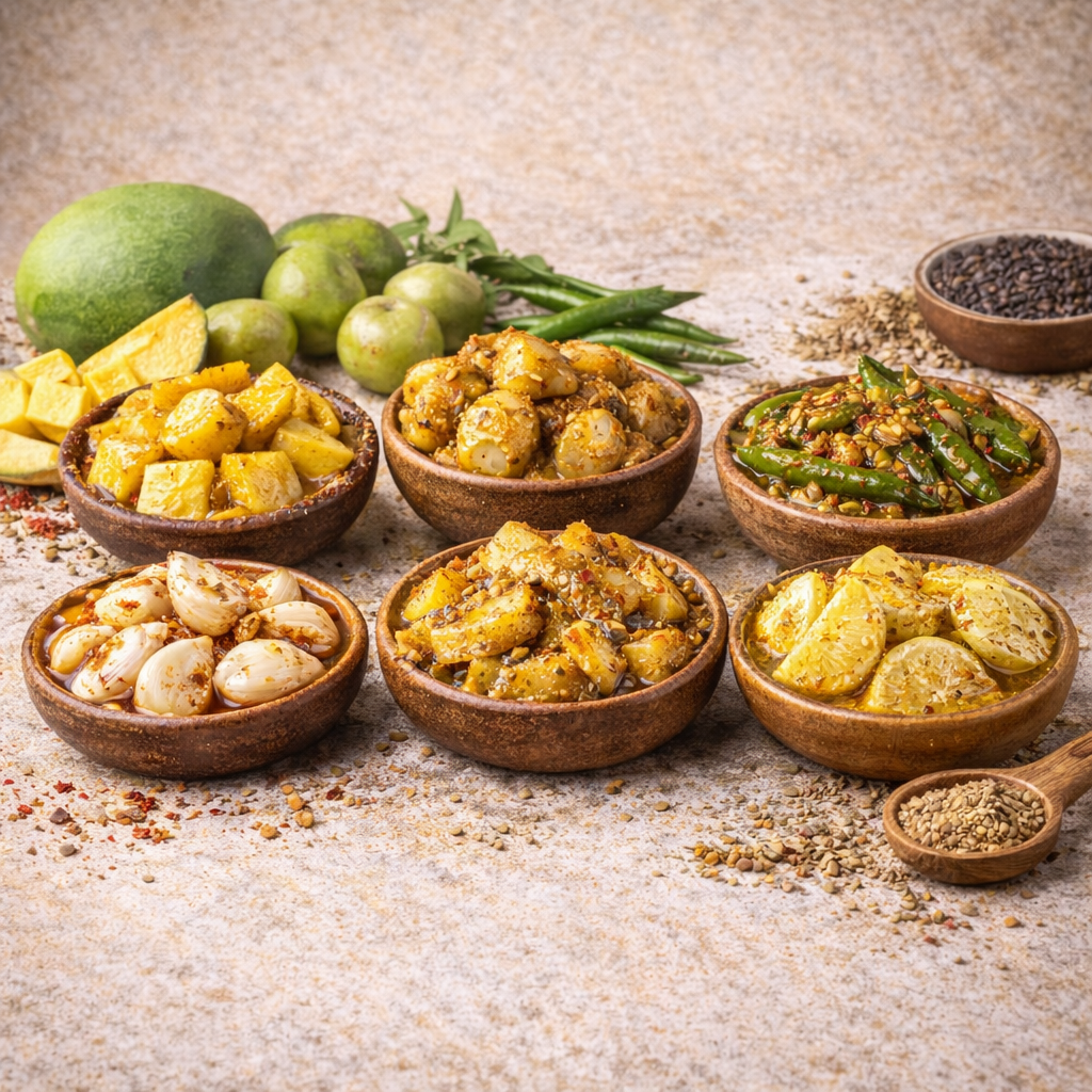 Mango Pickle, Mix Veg Pickle, Bharwa Green Chilli Pickle, Green Chilli Pickle, Galgal Pickle, Ginger Garlic Pickle, Amla Pickle, Khatta Meetha Pickle, Mixed Pickle.