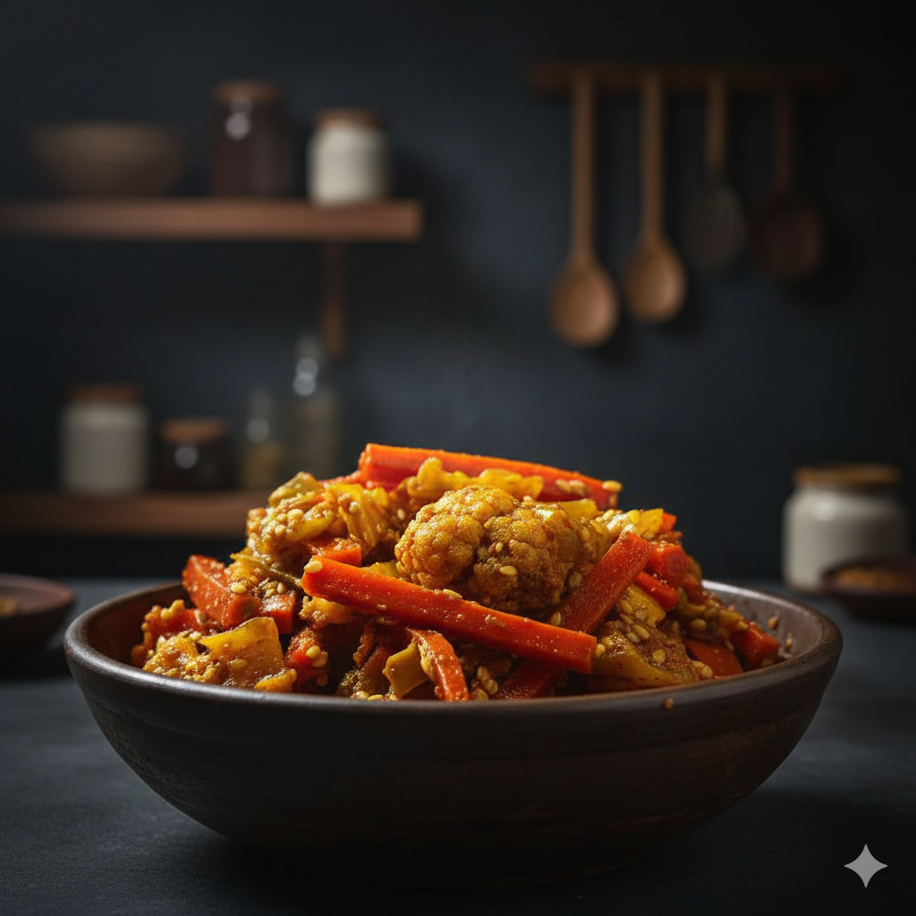 Enjoy the classic taste of Mixed Pickle, made with a delightful blend of seasonal vegetables carrot, Turnip and Cauliflower — all marinated in pure mustard oil and traditional Indian spices.